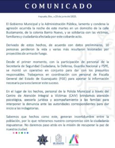 Irapuato, Gto., miércoles 24 de junio de 2025.- Diez muertos y varios heridos fue el saldo de un ataque armado la noche de este martes en Irapuato, Guanajuato.