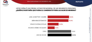La disputa interna en MORENA se perfila como la más cerrada. José Javier «Pepe» Aguirre y Abraham Sotomayor se encuentran en un virtual empate técnico: Aguirre lidera ligeramente con el diecinueve punto nueve por ciento, mientras que Sotomayor lo sigue muy de cerca con el diecinueve punto cuatro por ciento. Les siguen Ignacio Morales Rojas con el diez punto dos por ciento y Ricardo Gómez Escalante con el seis punto cinco por ciento. El veintidós punto dos por ciento de los encuestados «Aún No Decide». La estrecha diferencia entre los dos punteros anticipa una fuerte competencia por la nominación de este partido.