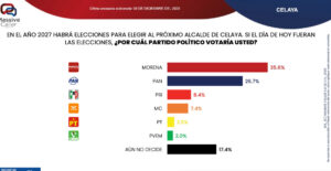 Irapuato, Gto., jueves 11 de diciembre de 2025. – La encuestadora Massive Caller ha hecho públicos los resultados de su más reciente estudio de opinión en el municipio de Irapuato, Guanajuato, con fecha de corte al nueve de diciembre de dos mil veinticinco, en el marco de la contienda electoral rumbo a la Alcaldía de dos mil veintisiete. El sondeo revela una ventaja inicial para el partido MORENA en la intención de voto por partido político.